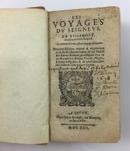 VILLAMONT (Sr de) - Les voyages divisez en trois Livres. 1 fort vol. in-18 cartonnage post. dos lisse, pièce de titre verte. Rouen Hérault 1613.