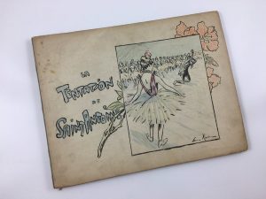 1 vol. in-4 oblong relié pleine toile grise, dos lisse illustré d'un semis de fleurs, premier plat illustré de danseuses avec Saint Antoine et sur le deuxième plat, le Saint protég é par son ange gardien, tranches rouges.