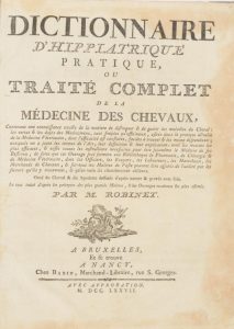Robinet (J). Dictionnaire D’hippiatrique Pratique ou traité complet de la médecine des chevaux. Bruxelles et Nancy, 1772. In-4° de [4]-10-508-[6] pages, basane, dos orné (Reliure de l’ép.)
