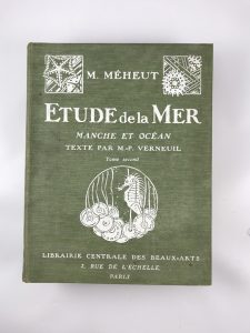 MEHEUT (Mathurin) Étude de la mer – Flore et faune de la Manche et Océan. Texte par M.-P. Verneuil. Avec 49 planches en couleurs hors-texte, montées sur onglets (la planche 6 est en déficit). 2 forts vol. in-folio reliés toile verte...