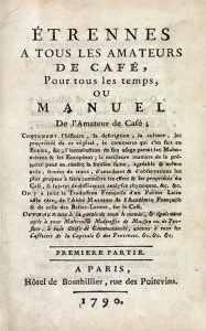 Unique édition de cet excellent ouvrage sur le café, sa culture, son histoire, son commerce, ses propriétés et les établissements parisiens qui le servent. Le volume se clôt avec un poème latin de l'abbé Guillaume Massieu sur Le Café accompagné de sa traduction française. ¶ Plaisant exemplaire dans sa modeste reliure d'époque. ¶ Coins un peu usagés avec manques. Quelques rousseurs et petites mouillures marginales. ¶ Mueller, 75.