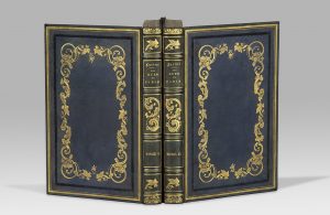 volumes grand in-8, maroquin bleu, encadrement de filets gras et maigre doré et à froid, composition de fers dorés rocaille dessinant un cadre central, dos orné, roulette à froid intérieure, doublure et gardes de papier moiré rose, tranches marbrées (Du Fitre).
