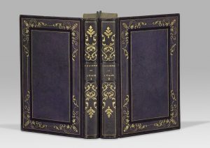 de rinceaux et fleurons d'angle dessinant une bordure, dos orné, quatre filets intérieurs, doublure et gardes de papier moiré ivoire, tranches dorées