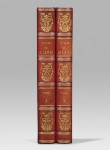 SWIFT (Jonathan) - Voyages de Gulliver dans des contrées lointaines. Paris, Fournier aîné, Furne et Cie, 1838. 2 volumes in-12, demi-veau cerise, dos lisse orné d'un fer spécial répété (Capé).
