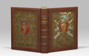 soulignés de filets à froid se prolongeant sur le bord des plats, titre doré, jeu de filets dorés intérieurs, doublure et gardes de soie brochée, tranches dorées sur témoins, couverture, chemise demi-maroquin et étui (Trincevel).