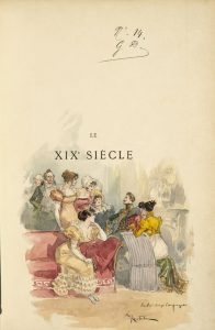 ♦ CHARMANTE AQUARELLE ORIGINALE de Robida sur le faux-titre, légendée Entre deux compagnes et représentant un officier dans un salon, racontant sans doute ses exploits militaires à de jeunes femmes admiratives.