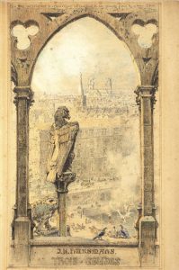 Il est enrichi d’UN SUPERBE DESSIN ORIGINAL AU CRAYON ET EN COULEURS de Charles Jouas montrant une vue de Paris et les quais de la Seine à travers un arc brisé de Notre-Dame, avec gargouille au premier plan ; ce dessin est accompagné d’un envoi au crayon de l’artiste au bon imprimeur M. Nourrisson, en souvenir de nos séances pour les bons à tirer.