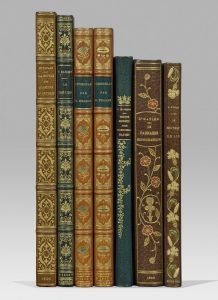FRAÎCHES RELIURES DE DAVID, ornées aux dos de fers spéciaux (éventail et ombrelle) évoquant le sujet du livre.