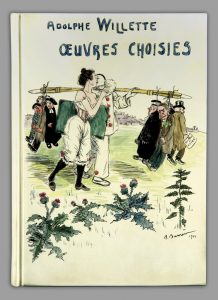 WILLETTE (Adolphe). Œuvres choisies, contenant 100 dessins choisis dans le Courrier français de 1884 à 1901. Préface illustrée de l’auteur. Paris, H. Simonis Empis, 1901. In-4, bradel vélin, composition peinte sur chaque plat, dos lisse...