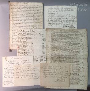 DOCUMENTS MANUSCRITS MORTUAIRES datés de 1670 à 1767 : Factures d’achats de cierges, Procurations et volontés testamentaires percheronnes (15pp), Etat de dépenses pour enterrement (6pp), Reçu pour fourniture de cierges, Paiement de legs,...