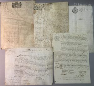 COTE d’OR] - Ensemble d’actes sur parchemin et vélin : Contrat de mariage de Claude Bougarro, chirurgien à Époisses (1708), vente (1718), jugement scellé à Beaune (1754), Réception d’un juge en la seigneurie de Grignon (1771), exploit...