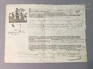 CONNAISSEMENT daté de juin 1786, passé entre P.A. Le Bourgeois, du Havre, propriétaire du Solide, navire transportant café et coton. Le document est signé par les intervenants.