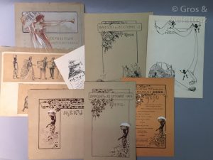 Ensemble de dessins, encres et gouaches réalisés pour différents projets tel que ceux pour l’Association Cotonnière Coloniale pour laquelle il décora des menus destinés au premier diner d’anniversaire de l’association, le 12 octobre 1903, ou pour l’Exposition Internationale d’Hygiène, Sports et Sauvetage d’août 1904.