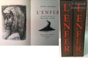 [GOERG] - DANTE ALIGHIERI. L’Enfer. Paris, Porson, 1950, 2 volumes in-4 en feuilles sous couvertures illustrées, chemises et étuis décorés.