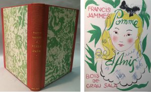 [GRAU SALA] - Francis JAMMES. Pomme d’Anis. Paris, Le Cheval de Bois, 1946, In-4 relié plein maroquin rose de Tellier, à encadrement doublé de daim, dos lisse, étui bordé et platsrecouverts de papier vert conçu par GRAU-SALA.