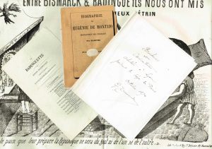 ─ Biographie de Eugénie de Montijo par Marfori, « Le grand tracas du bon gendarme », 4 grandes caricatures (38 x 46 cm) autour de Napoléon III (Badinguet), « La Badinguette » par Henri Rochefort /