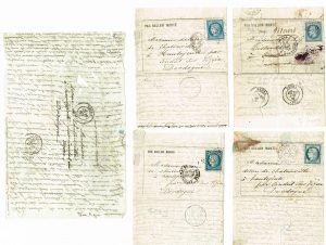 2 octobre, 17 octobre, 29 octobre et 4 novembre 1870 - Pour la première, marque « par ballon monté » de la main de Madame Tissandier, pour les 3 autres, utilisation d'un papier à lettre avec mention « par ballon monté » imprimé /