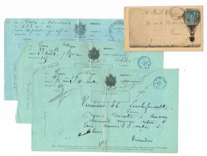 AÉROSTATION - •1°) 2 télégrammes de Gaston à sa famille, 1er et 2 août 1869 : « Grand succès temps splendide excellent départ à 6 h 30 du soir » et « « Bonne descente à Rouvres charmant voyage retour à Paris demain matin à 6...