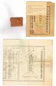 • Province d'Isé (Japon) : intéressant souvenir, il s'agit d'un « médicament vendu par les prêtres » au Temple de Asama, près de Yamada, quelques graines sont conservées dans un papier plié, le remède était vendu dans une enveloppe imprimée et illustrée et étaitt accompagné d'un papier explicatif /
