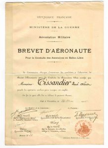 • Brevet d'Aéronaute pour la conduite des Ascensions en Ballon Libre de 1905 (Aérostation militaire).