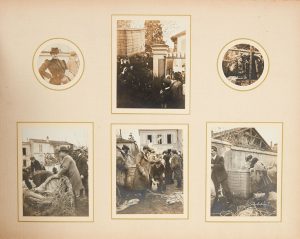 • Concours de Madrid oct. 1905 (foule au départ, élégantes, nacelles, ballons en plein ciel, vues du ballon, pliage), photo de PT et La Vaulx avec les aérostiers militaires espagnols (tous ont signé) -
