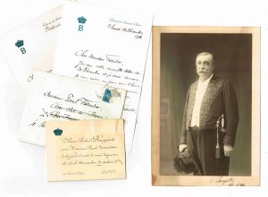 PRINCE ROLAND BONAPARTE [1858-1924] - Géographe et botaniste / Photo originale par Eug. Pirou (13,5 x 21 cm) montée sur carton (16 x 23,5 cm écourté) le représentant en tenue d'Académicien, signée de sa main / 2 LAS et une invitation