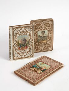 ENSEMBLE DE 3 CARTONNAGES ROMANTIQUES in-12 À VIGNETTE CHROMOLITHOGRAPHIÉE DE MONTGOLFIÈRE.