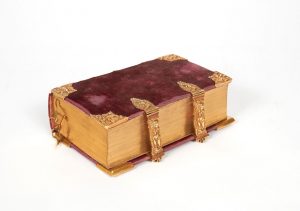 Reliure post. plein velours aubergine, renforts en bronze dorés figurant des chérubins dans chaque angle, fermoirs en bronze assortis (JC Forant, 06 Fébruary 1704), tranches dorées.renfermée dans une boite étui à dos factice.
