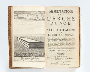 LE PELLETIER : Dissertations sur l'Arche de Noé et sur Hemine et sur la livre de S. Benoit. Rouen, Jean B. Besongne, 1700. Un vol. in-12 de [14]-614-[4] pp., fr., 2 pl., rel. plein maroquin janséniste havane, roulette intérieure, tranches dorées...