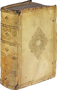 TACITE. Historiarum et Annalium libri qui exstant, Justi Lipsii studio emmendati & illustrati. Anvers, Christophe Plantin, 1574. In-8, vélin ivoire, double filet doré, cartouche azuré central, dos lisse orné de roulettes et fleurons dorés,...