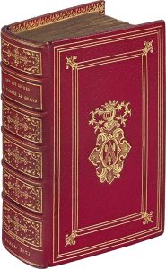 Roy Tres-chrestien. Paris, Claude Micard, 1571. In-16, maroquin rouge, triple filet doré et encadrement intérieur à la Du Seuil, armoiries dorées au centre, dos orné aux petits fers, coupes et coiffes décorées, roulette intérieure dorée, tranches dorées (Simier r. du roi).
