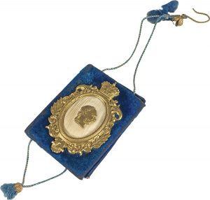 [CARNET DE BAL]. Meidlinger Bürger-Ball 17. Februar 1898. Vienne, Atelier E. Döhle, [1898]. In-32 (env. 7,5 x 6 cm) de 2 ff.n.ch., velours bleu, médaillon en métal doré contenant sur fond de soie blanche un portrait de profil coiffé de lauriers...
