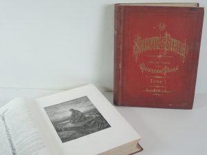LA SAINTE BIBLE, traduction nouvelle SELON LA VULGATE par MM.J-J BOURASSE et P. JANVIER. DESSINS DE GUSTAVE DORÉ, ornementation du texte par GIACOMELLI. TOURS ALFRED MAME 1874. 2 tomes, cartonnage éditeur abimé et taché à plusieurs endroits.