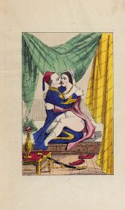 Édition originale, bien complète de la suite de 12 figures libres coloriées, qui manque souvent. ¶ « Ouvrage très érotique, dans le genre des postures de Pierre Arétin, écrit pour la première fois en arabe, traduit en turc, autographié à Erzeroum, l'an de l'Hégire 1292 (1877), et mis en françois en 1880. » (Notice des éditeurs dans un catalogue clandestin, citée par Dutel). ¶ Dos insolé, rousseurs sur la couverture conservée et petits manques au dos de celle-ci. ¶ Dutel, n°473 – Gay-Lemonnyer, II, 908 – Pia, 755.
