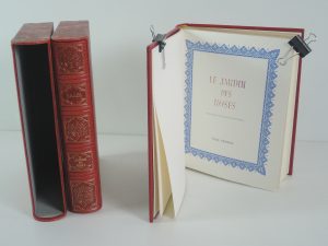 LE JARDIN DES ROSES DE SAADI, traduction française de CHARLES DEFREMERY, ART ET COULEURS 1980. Miniatures Persanes aquarellees aux pochoirs de LUCIE BOUCHER. 1835/2340 sur vélin. 2 vol reliés en pleine peau maroquinée, tête or, décor estampé...