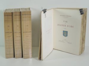 ANATOLE FRANCE, VIE DE JEANNE D'ARC, à PARIS chez MANZI, JOYANT, CALMANN-LEVY 1910. 29/300 sur hollande. 4 forts vol brochés contenant chacun de nombreuses illustrations avec légendes sur serpente. Bon état.