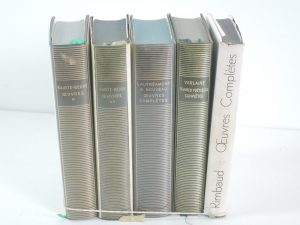 PLÉIADE : RIMBAUD, ŒUVRES COMPLÈTES 1951. LAUTREAMONT, GERMAIN NOUVEAU, ŒUVRES COMPLÈTES, 1970. VERLAINE, ŒUVRES POÉTIQUES COMPLÈTES 1957. SAINTE BEUVE, 2 tomes 1951. Couv et rodhoïde sauf pour un vol.