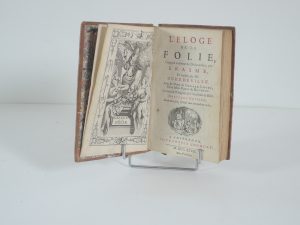 L'ÉLOGE DE LA FOLIE composée en forme de déclamation par ÉRASME et traduit par Mr GUEUDEVILLE, avec les notes de GÉRARD LISTRE et les belles figures de HOLBEIN, à AMSTERDAM chez FRANÇOIS L'HONORÉ 1728. In 12 (17x10), privilège, avertissent,...