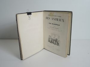 GRANDVILLE, SCÈNES DE LA VIE PRIVÉE ET PUBLIQUE DES ANIMAUX, MARESCQ, GUSTAVE HAVARD 1852. Texte de BALZAC, NODIER, GEORGE SAND… TEXTE IMPRIMÉ SUR DEUX COLONNES, nombreuses illustrations. In-folio, demi bas, dos fileté, titre or.
