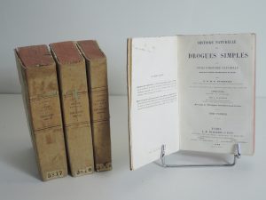 HISTOIRE NATURELLE DES DROGUES SIMPLES ou cours d'histoire naturelle par N .J .B .G. GUIBOURT, PARIS, BAILLIÈRE 1869. 4 tomes In-8° 900 figures dans le texte, fortement rogné et à la reliure recouverte de papier, titre au dos.