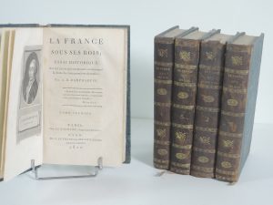 A.H.DAMPMARTIN : la France sous ses rois, essai historique, PARIS, LYON, 1810. 5 volumes, frontispice au 1er tome. demi veau, dos long, titre or, fleurons et palettes.
