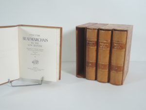 BEAUMARCHAIS, SA VIE SON ŒUVRE, 1732-1799, PARIS, UNION LATINE D' ÉDITION 1932. 4 vol , IN-8°, n°451 sur lafuma. Pleine bas., tête or, titre et tomaison or .
