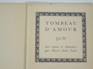 TOMBEAU D'AMOUR, DEUX SONNETS DE SHAKESPEARE par PIERRE JEAN JOUVE, PARIS, G L M 1937. 89/250 sur vélin crème. Édition originale. Couv sale et feuilles volantes.