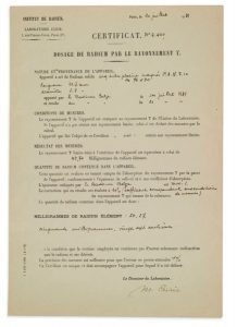 Certificat de radium par rayonnement gamma établi par Marie Curie comme directeur du laboratoire, sur un échantillon de radium belge, avec les mesures et résultat de coefficient.
