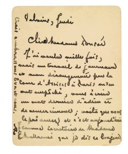 (...) C'est aujourd'hui comme secrétaire de Madame Mallarmé que je dis ce bonjour. L'installation a été lente à Vavins, à peine m'y suis-je sorti ces jours derniers, cela vient de ce merveilleux Honfleur qui toujours s'interposait entre mon regard et le paysage humilié d'ici.