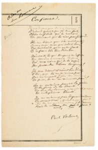 6 strophes du poème «Confiance» que Verlaine publiera pour la revue La Plume en octobre 1892, avec légère variante par rapport à sa version définitive et corrections in-fine.