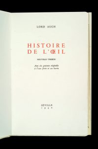 Bellmer/[BATAILLE (Georges)] Lord AUCH - Histoire de l'œil. Nouvelle version. Avec six gravures originales à l'eau forte et au burin. Séville, [Paris, K. Éditeur], 1940, [1947]. In-8, broché, couverture rempliée, chemise, étui.