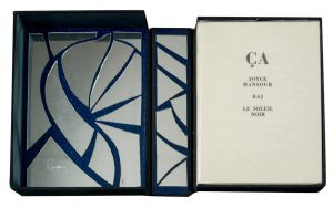 Broché couverture rempliée, contenu dans un étui-boîte noir recouvert de miroirs avec le mot Ça en grandes lettres coloriées sur chaque plat et le dos, intérieur doublé de fragments de miroir brisé signé.