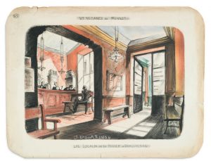 DÉCORS DE CINÉMA - Huit maquettes au fusain noir et de couleur réalisées par J. DOUARIANOU (1906-1989) pour des décors divers dont le film "La Rage au Ventre". Dimensions 50 x 65 cm env.