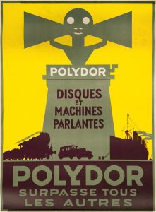 PHONOGRAPHES - POLYDOR. Disques et machines parlantes. Affichette montée sur baguettes. NE. 60 x 44 cm. Petite déchirure en bordure.